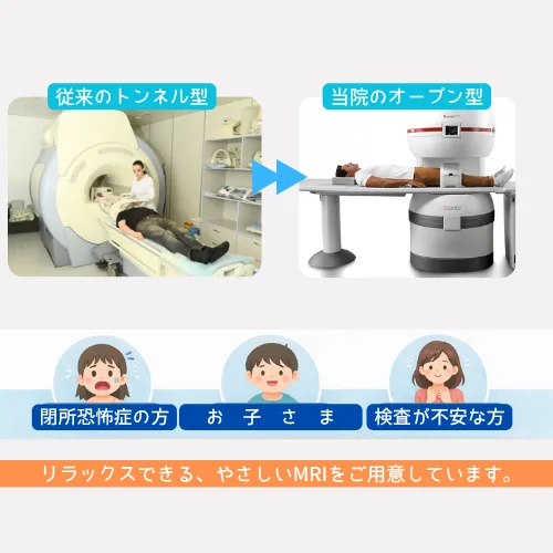 従来のトンネル型MRIは、狭く閉塞感が強いため、不安や恐怖を感じてしまう方も少なくありません。